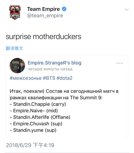 帝国在TI8国际邀请赛的地区公开赛中失利后,很快地再度进行了阵容洗牌。不得不说,帝国在此前就经历过多次人员变动但均一无所获,丝毫没有打出一点成绩,反而是官推疯狂耍宝为人所熟知。