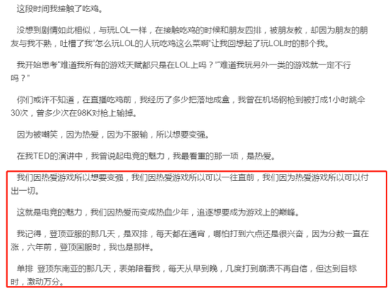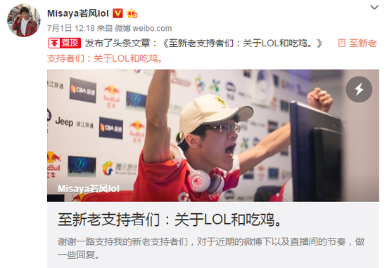 7月1日,若风也是在微博发表了长文来回应这一说法:虽然这段时间,LOL播的不多,更多时间在直播吃鸡,但不代表我放弃了LOL。