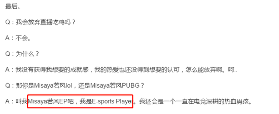 最后,如果大家非要问以后到底是叫Misaya若风LOL还是Misaya若风PUBG,若风表示:以后叫我Misaya若风EP吧。(E-sport Player),花有重开日,人无再少年。这么多年过去了,若风仍是那个一直在电竞深耕的热血男孩。