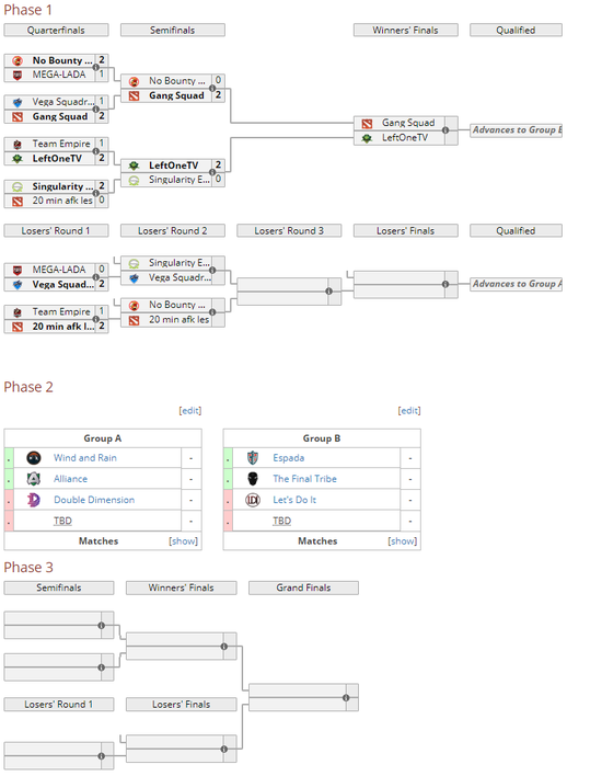 第二阶段:两支晋级队伍与六支受邀到第二阶段的队伍分为两组进行 Bo3 双败制淘汰赛,每组前两名将晋级到第三阶段。