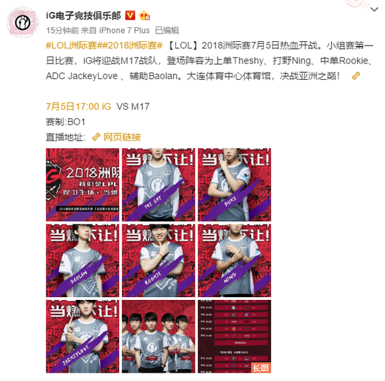 iG战队公布了对阵M17的首发阵容:TheShy、Ning、Rookie、JackeyLove、Baolan。