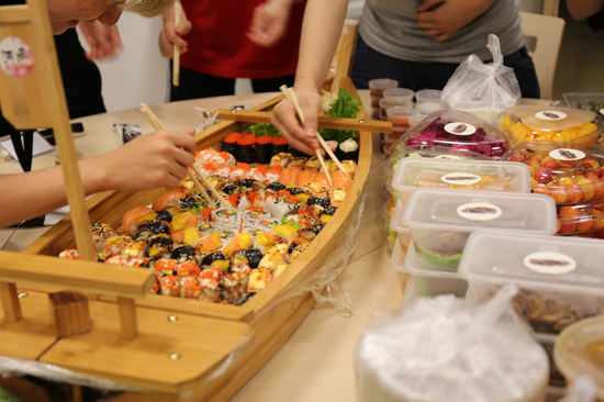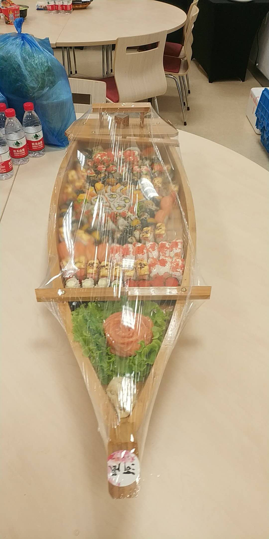 晚餐中,最豪华的莫过于寿司战舰了。这份“战舰”需要三个人才能抬起,在抬进会场食堂时还的引发了不小的轰动。当别人都在吃蛋炒饭和泡面,这艘战舰可谓“杀伤力”巨大!