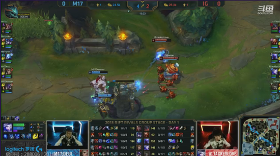 比赛前期,IG的打野酒桶在上路主动动手,帮助剑魔拿到了诺手的一血。但是IG的中下两路不是M17的对手,最终M17在小龙团中拿下小龙赢下团战,IG拿到了上路的一血塔,经济整体持平。但是The shy的剑魔经济已经完全领先诺手。