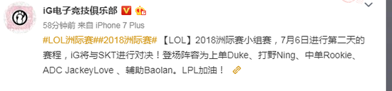 iG电子竞技俱乐部在7月5日晚上发布了6日的首发阵容: