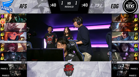 AFS首抢了Scout擅长的佐伊,EDG则秒锁了亚索进行回应。AFS随后选出惩戒霞与洛走中野,佐伊转到下路。EDG最后一手选出Ray招牌皇子。