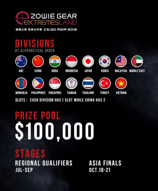 本届极限之地CS:GO亚洲公开赛共包含15个赛区,分别是:中国、台湾、蒙古、中东、印度、印尼、泰国、马来西亚、澳洲、新加坡、菲律宾、越南、日本、韩国以及首次加入的土耳其赛区。比赛共分为两个阶段:从即日起至9月在各赛区当地举办预选赛;10月18日到21日在中国上海举办亚洲总决赛。
