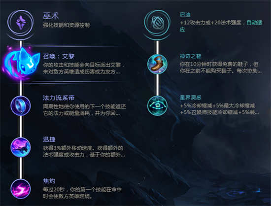 娜美的符文配置有两套。第一套是常见的巫术搭配启迪。基石符文选择艾黎,增加W的伤害,并且能让W和E技能给队友带上护盾。法力流系带用W技能很好叠满,保证蓝量。迅捷则是提升了移动速度,进而增加了跑线能力。最后一栏选择焦灼,增加消耗能力。副系选择神奇之鞋节约经济,星界洞悉提升冷却缩减。