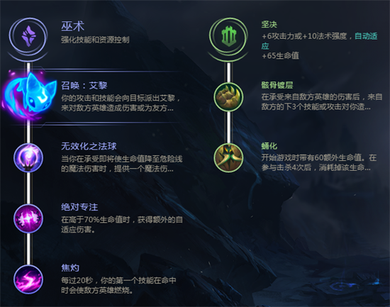 具体来说,基石符文还是选择艾黎。但是接下来的选择就不一样了。选择无效化之法球,保证娜美在中期避免被敌方快速击杀,提升生存能力。绝对专注非常适合娜美,由于W技能可以回血,娜美可以让自己经常保持在70%的血量以上,从而可以多次触发绝对专注。最后一栏还是选择焦灼。副系选择坚决来强化娜美的生存能力,骸骨镀层和蛹化的选择可以让娜美作为脆皮辅助却能在前期拥有不错的坦度,避免被对线强势英雄击杀。