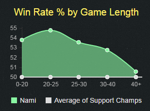 娜美是一位非常全面的辅助。无论是软辅的回血和保护,还是硬辅的开团和控制,娜美都能信手拈来。作为当前版本美服的最强辅助,娜美的胜率在各个时间点都是超过50%的,也就是说娜美的各个时间点都属于强势。但是在这其中最为强势的还是在前中期,娜美在前中期可以凭借自身的全面在下路打开缺口,进而滚起雪球拿下比赛。如果拖到后期,娜美的全面反而让娜美的各方面都不出彩,脆弱的身板也让娜美很容易被秒杀。