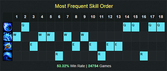 娜美的技能加点如上,主W副E是美服使用率最高的点法,两万场的实践证明了它的可靠。W技能是娜美最主要的对线技能,一个技能兼具了回复和消耗双重作用,配合艾黎即可以给队友加护盾也可以疯狂消耗对手。E技能是娜美一个很强的辅助技能,其灵魂就在于附带E的普攻可以减速对手,在对线试图击杀或者配合GANK的时候有奇效。Q技能前期只需要点一级即可。