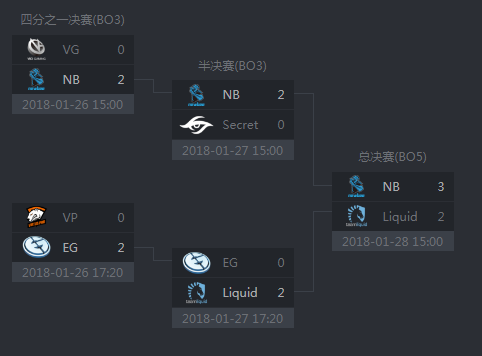 ESL云顶站,16支队伍被分成两个小组。上半区率先出线的是VP与秘密,下半区则是液体与Newbee。由于在小组赛中再度不敌液体,赢了小精灵却输了奇迹卡,国内观众对着Newbee又是一顿长吁短叹。但是在进入淘汰赛后,Newbee先是二比零轻松解决老朋友VG,紧接着不可思议的一幕发生了——Newbee二比零淘汰了刚刚在梦幻联赛上夺冠的秘密。那个BO3中,Newbee的小娜迦萨尔体系大放异彩,秘密的各种花招在这两个不讲道理的英雄面前形同虚设,最终Newbee挺进了总决赛。