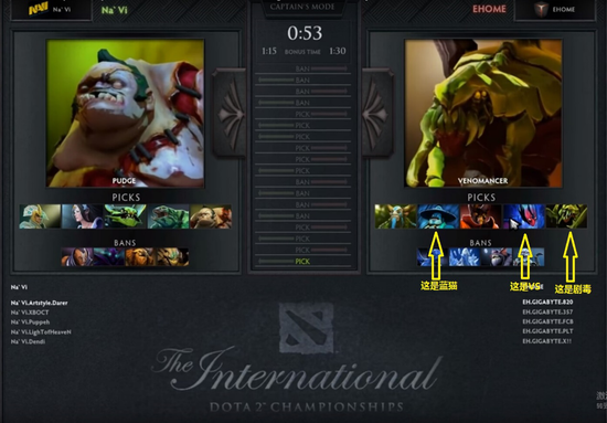 当时DOTA2只有不到三十个英雄可以使用,所以双方BP都很快,EHOME阵容为一号位DOOM、二号位蓝猫、三号位先知、四号位剧毒和五号位VS,而Na’Vi阵容是一号位POM、二号位毒龙、三号位屠夫、四号位陈和五号位潮汐。(是的那个年代潮汐都是打五号位的)