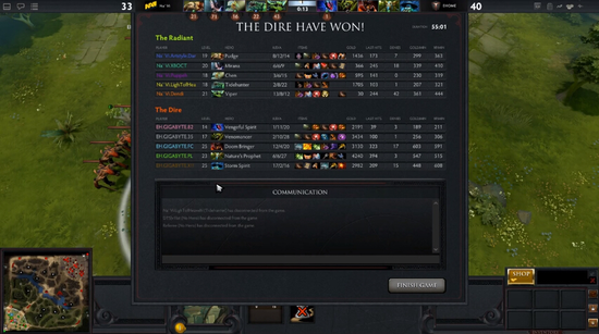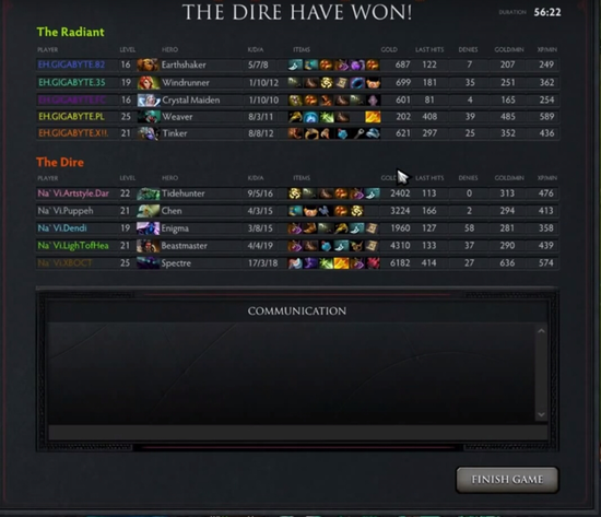 40分钟后随着EHOME众人装备成型,Na’Vi正面战场已逐渐支撑不住,EHOME三次上高破掉Na’Vi三路,最后一波EHOME完成一换六后Na’Vi打出GG。