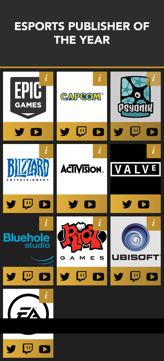 此外,eSportsAwards也公布了公布年度电竞游戏出版公司奖提名,他们分别为: