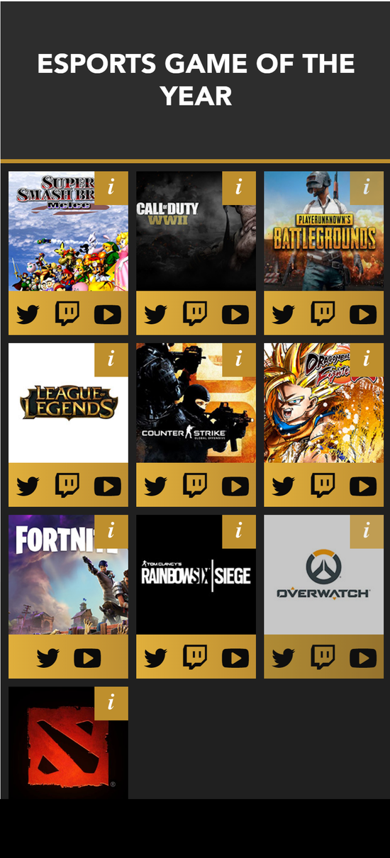 《绝地求生》《英雄联盟》《堡垒之夜》《龙珠斗士》《使命召唤:二战》《任天堂明星大乱斗Metee》《彩虹6号》《DOTA2》《CS:GO》《守望先锋》,你可以登录https://www.esportsawards.com/vote页面为你喜欢的游戏投票。
