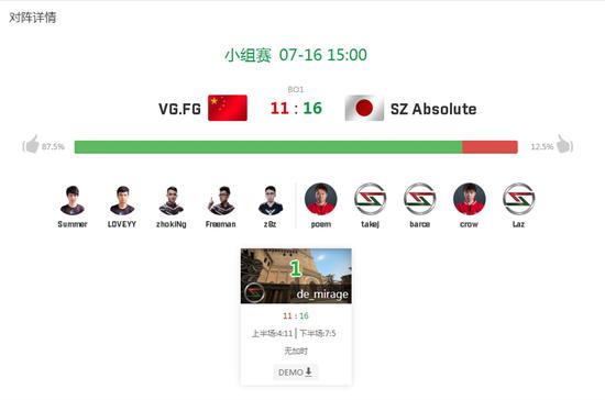 下半场SCARZ放A防守VG刚好选择打A,下包后LOVEYY率先拿到两个击杀为队伍锁定了手枪局的胜利,第二回合SCARZ钢手枪第二时间反清A1后VG只能选择强攻B区,四人回防的SCARZ将VG队员全部拖死并保下一把AK。下一把SCARZ强起却没有聊到VG选择了一波简单的RUSH B,VG无阵亡进入包点后拿下第七分并将对手打入经济局。第一个长枪局VG一波死亡RUSH A被对手在警家轻松架掉两名二楼的土匪,走A1的LOVEYY和Freeman扳回人数劣势后最终还是被警家的LAZ狙掉,SCARZ拿下第十二分。二十一回合SCARZ主动前顶中路防守,双方一波中路乱战后VG占据了场面优势再扳一分并重置了对手的经济,SCARZ连续ECO两局后VG将比分追到11-12仅落后一分。关键第二十四回合crow和takej两人轻松刷掉了VG的B区五人强攻拿到第十三分,SCARZ经济得到缓和后连拿两分15-11拿到赛点。二十七回合VG拿到中路控制后极限时间打A,缺少道具的VG被LAZ在警家用狙击枪连收三人,最终VG以11-16不敌SCARZ率先落入败者组。