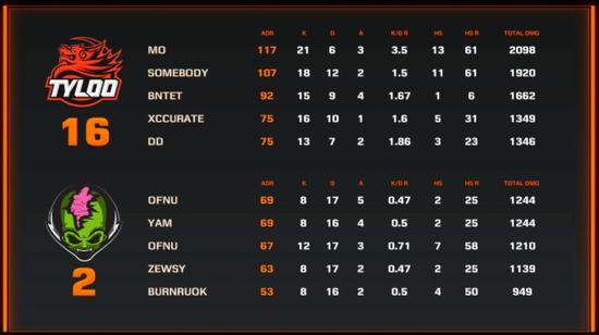 下半场手枪局TM复制TYLOO的手枪局战术同样选择一波简单的拉A区下包,但somebody和DD回防完成2打3拆包拿下手枪局,第二回合TM的B区爆弹也被somebody和BnTeT轻松接住,比分来到15-2,TYLOO手握13个赛点。第十八回合双方一波中路乱战后剩下yam1打2,仅有一把鸟狙的他双拳难敌四手被BnTeT制裁,TYLOO以16-2轻松战胜Tainted Minds,两战全胜晋级淘汰赛。