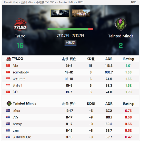 Faceit Major亚洲区Minor的B组胜者组由中国队伍TYLOO战队对阵澳洲队伍Tainted Minds,胜者将成为B组第一支出线的队伍,地图最终来到mirage。