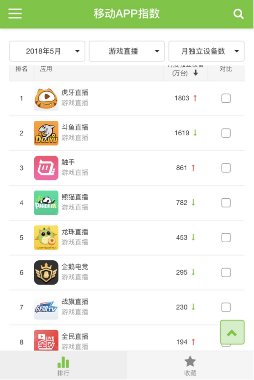 根据艾瑞咨询公布的5月游戏直播app指数显示,虎牙、斗鱼、触手直播分列行业前三,处于第一梯队,而熊猫直播、龙珠直播、战旗直播、全民直播紧随其后,分列第四至第八。同时艾瑞咨询发布的《2018年中国电竞行业研究报告》也显示,2017年中国电竞市场整体规模突破650亿元,其中移动电竞游戏市场规模在2017年迎来了爆发式增长,截止2017年底,移动电竞市场规模已经与端游市场规模占比持平。其中,端游电竞市场规模为301亿,移动电竞市场规模为303亿。
