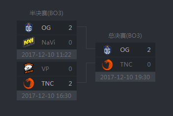 前往澳门之前,TNC先去了一趟深圳。在那里,他们拿到了China Top 2017的冠军。和之前的马尼拉一样,这也是一个无关紧要的表演赛。不过,能从VGJ.T和IG的身上抢下冠军,也证明TNC找到了打比赛的手感。12月初的MDL澳门站,TNC在小组赛以五胜三负的成绩惊险晋级。之后的淘汰赛第一轮,则曝出了一个惊天大冷门——VP被TNC二比零带走。现在回头想想,这可能是VP演走Lil的第一步棋。不过,TNC在BO3首局的表现也是可圈可点的。当时,瑞文操刀龙骑士顶住了VP的火力,Kuku的双修影魔则打出了致命的伤害。击败VP后,TNC一副志在必得的样子。谁也没想到,他们会在决赛被OG碾压出局。