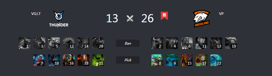 淘汰赛,在狼人稳定被Ban的情况下,赛老师只能操作像露娜、蚂蚁这样的英雄。但就算这样,TNC与NB依然被VGJ.T碾压出局。而值得一提的是,至少在这个阶段,Freeze的发挥并没有人们想象中那么不堪。中路操作影魔与军体拳的TA对线,Freeze占了上风。凭借着双核的良好状态,VGJ.T杀入了Major的总决赛。但非常可惜的是,在总决赛中等待着VGJ.T的不是别人,正是火力全开的VP大魔王。就像NoOne在赛后采访中所说的一样,这是一场毫无悬念的总决赛。VP早就预料到了对手的每一个动作,将VGJ.T杀的人仰马翻。