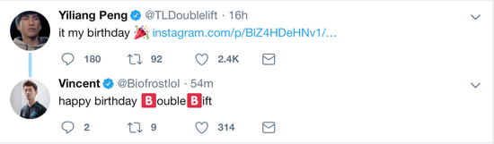 今天Team Liquid的ADC选手Doublelift迎来了自己的25岁生日,在他的推特下小王(辅助选手Biofrost,他的前搭档)也回复了一条充满“爱意”的评论~