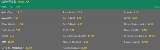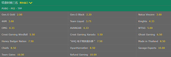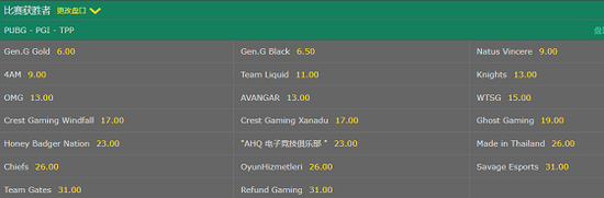 TPP模式中该网站则更加看好来自东方的战队,韩国双雄Gen.G Gold与Black占据前二的位置。中国区预选赛TPP模式冠军4AM(夺冠赔率9倍,前三赔率3倍)与OMG(夺冠赔率11倍,前三赔率4.33倍)也都位居前列。