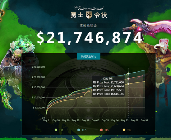当前Ti8小绿本奖金池比同时期的Ti7蓝本奖金池领先58,487 (0.29%)美金,已达到去年总奖金池24,787,916美金的87.7%。