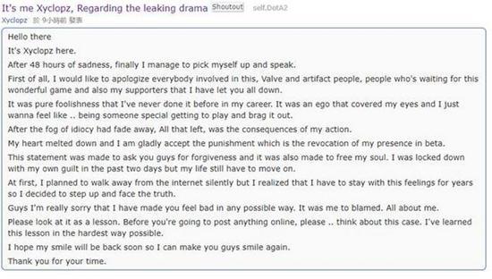 在今天这位名叫Xyclopz 的解说就公开道歉了: