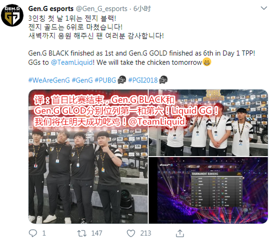 PGI首日战罢,韩国战队Gen.G Black战队领跑总积分榜。虽然他们四局比赛没有一局吃鸡,但凭借两个第2名与一个第3名的战绩,夺下了首日积分榜第一名。值得注意的是,Gen.G俱乐部旗下另一只战队Gen.G Glod也位列总积分榜第六,可谓是春风得意。他们的官方推特在赛后骄傲地炫耀了这一战绩,并向Liquid挑衅道:“我们将在明天吃鸡!”这是否在狂妄的暗示,他们将在明天拿下冠军?
