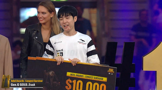 在个人奖项方面,Gen.G Gold明星选手EscA包揽了击杀王和生存王两项大奖,三次登台风光无限。