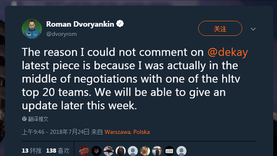 关于Dekay的言论,VP经理发推表示:我之所以无法回答Dekay的最新消息的原因,是因为我目前正在与HLTV战队排名前20的某个队伍协商,在本周晚点的时候会给大家一个答复。