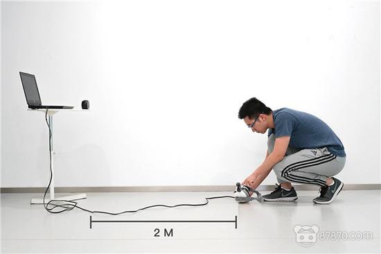 6.将已经安装好头盔定位器的小米VR一体机放置在正对定位基站、距离2米之外的水平地面上,确保小米VR一体机和定位基站之间没有遮挡;按下头盔定位器上方的配对键,即可自动完成高度定位校准地平面;