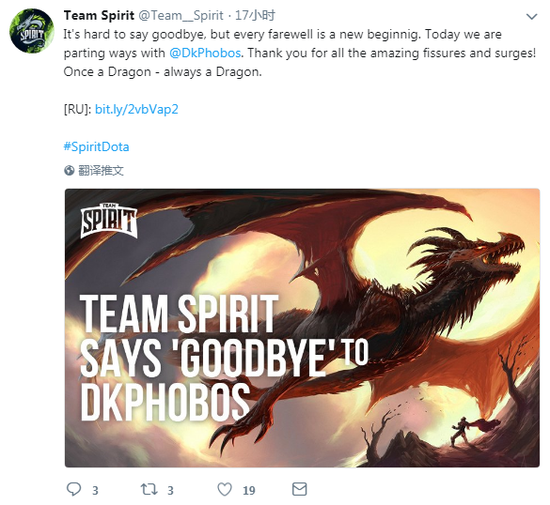 Team Spirit发布推特称,老将DkPhobos离队,并感谢这名老将为队伍做的一切贡献。
