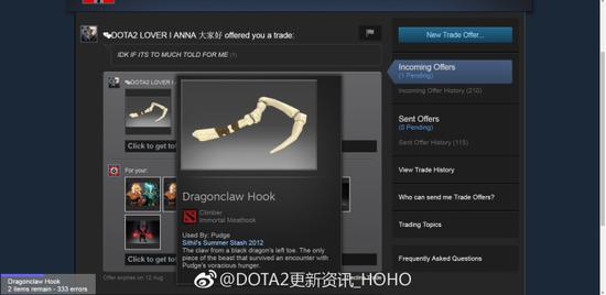 昨天刀友angelof1991在reddit爆出目前dota2最高明的诈骗方式,某个游戏制作者制作了一款叫做“Climber”的游戏并且通过STEAM审核,之后游戏制作者在游戏里面添加了一个可交易的饰品,将该饰品的图片和说明做的跟DOTA2的龙勾一模一样,如果不仔细看的话(饰品介绍说明里面的游戏名称不同,可以看到写的是“Climber”,而不是“Dota2”),就算是交易老手也会上当受骗,刀友以后交易贵重饰品也多注意一下。目前这款游戏已经被STEAM下架,但还是挺无语的,有些人为了诈骗,真是什么方法都能想到,希望大家提高警惕,提防交易陷阱。