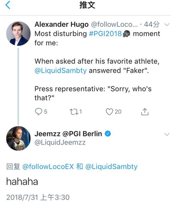 近日,国外知名电竞媒体TheShotcaller编辑Alexander Hugo,在推特上分享了一件在PGI上最令他不爽的事,就是在Liquid液体队员Sambty接受采访,回答谁是他最喜欢的选手时,Sambty回答:Faker,然后媒体的反应是:抱歉,他是谁。