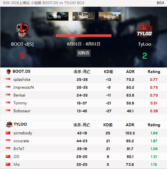 IEM上海站首日B组胜者组决赛,TYLOO遇上了自己的老对手新加坡战队BOOT.ds,两队的胜者将以B组第一名的身份直接晋级淘汰赛,地图BP情况如下: