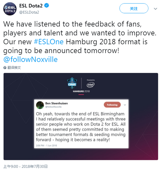 北京时间8月1日晚,ESL One宣布按照此前Valve公布的新赛季计划,ESL One汉堡站2018将退出2018-2019DPC赛季。尽管参赛选手不再获得DPC积分,这场赛事仍会在10月23号到28号举行。