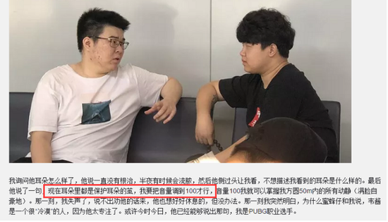 在南都的采访中,韦神曾提到了自己手腕的伤病。他没有告诉南都,真正可能让他绝地求生职业选手生涯结束的耳朵暂时性失聪。耳朵失聪的那段时间,是韦神战队成绩最差的时候,他一边往返于医院和训练基地,一边顶着耳朵失聪实力大幅下滑的问题继续训练、打比赛。那段时间,他咬着牙撑过了质疑、撑过了4AM的磨合期、撑到了4AM拿到PGI的门票。刚到柏林,由于水土不服,韦神和4AM队员醒目都病了,但比赛结束至今他并没有为自己的失败找任何借口。在PGI结束之后第二天,韦神和OMG的队员一直在聊自己的发挥问题。跟随他们一起去德国柏林的工作人员,也亲眼看到了韦神伤痕累累的耳朵。韦神的耳朵没有康复,他只是把耳机的音量调到了100%,用足以轰疼耳膜的音量保证自己不会因为听力问题而拖后腿。而他对此不以为意,因为他认为自己是一个PUBG的职业选手,理应如此。
