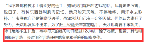 在南方都市报的采访中,这位在直播里不爱过多聊起自己生活的选手曝光出了更多的细节。被外界称之为天才型选手的他自认为天赋不足以立足职业圈,每天都要维持12小时的训练。除了吃饭睡觉之外的时间,韦神都坐在电脑面前训练。南方都市报总结了韦神六年的职业生涯,用了“绝地求生”这个词,而这个词也能够解释为什么韦神能够成为国内绝地求生粉丝最多的选手:从S5的失利到成为绝地求生职业战队4AM的队长、老板,韦神六年的职业生涯就是在“绝境中寻找希望”。