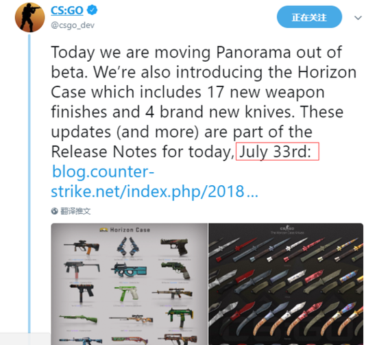 对了,CSGO官方推特今天特地说明:官方的确在月底进行了全面更新,没错,今天是7月33日(滑稽)