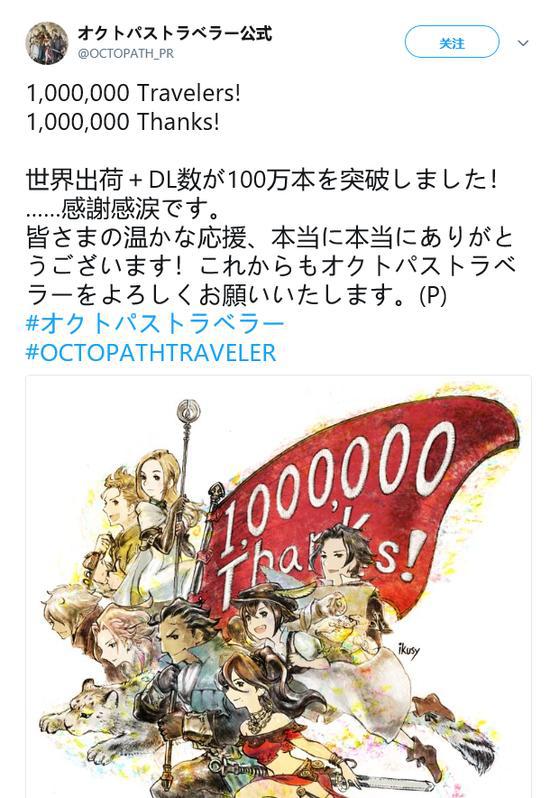《八方旅人》官推发文庆祝游戏出货量加上数字版销售已经突破了100万,同时感谢了玩家。看来即使是实体缺货也挡不住《八方旅人》大卖。
