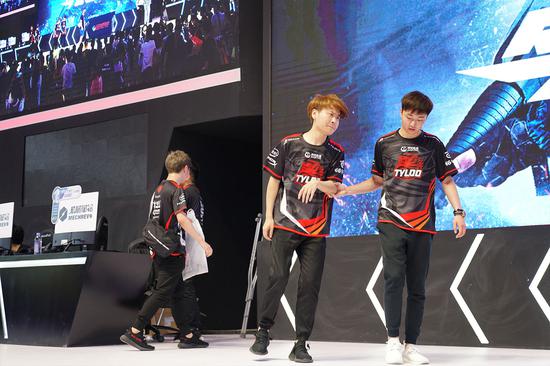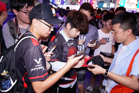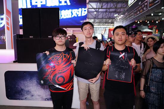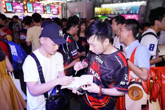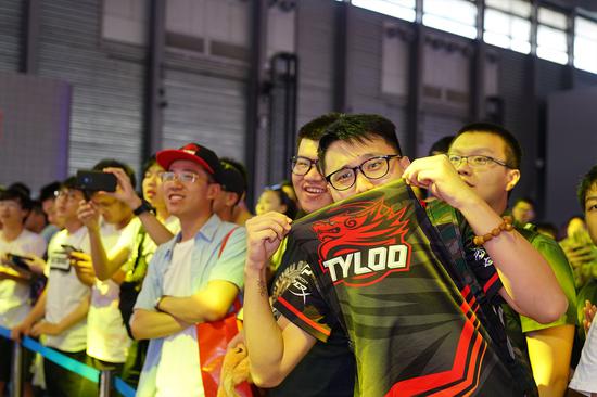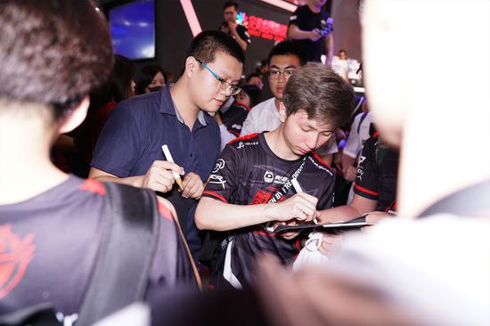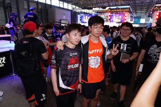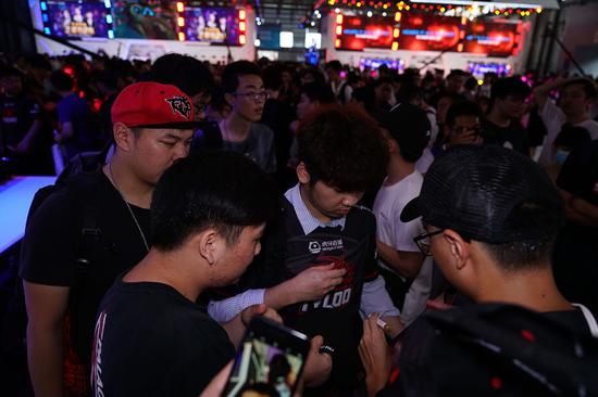 原本今天最后的压轴大戏是TyLoo六人同台水友赛,但IEM上海站战况激烈,打满三图5个加时,因此水友赛碍于时间问题被迫取消。GO哥对在完美世界展台下苦苦等待几个小时的玩家感到抱歉,TyLoo选手在获胜后立刻赶来完美展台,尽管无法如期打水友赛,但和现场玩家做互动留念。棒棒~~