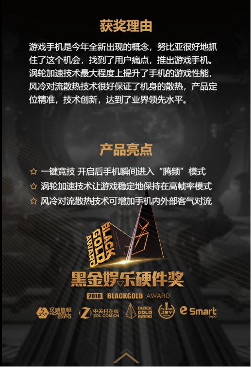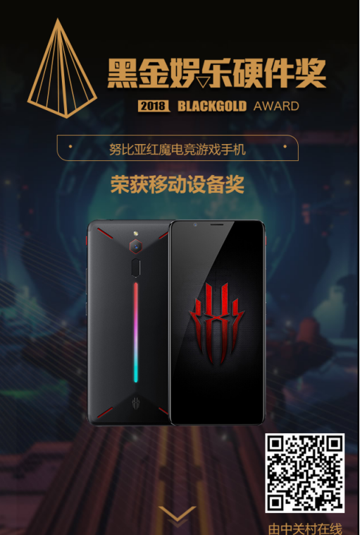 在让我们会带今年荣获2018年黑金奖移动设备奖的努比亚红魔游戏手机身上,努比亚红魔游戏手机,更以出色的游戏体验,众多黑科技(如散热技术)满足了消费者需求,为中国手机电竞之路提供强有力的支持,可以说,努比亚能够在强者如云的黑金娱乐硬件大奖中斩获大奖,实至名归,在未来也希望努比亚能继续坚持创新,与国产手机厂商们能共同发力创新,用更优秀的产品回报消费者。