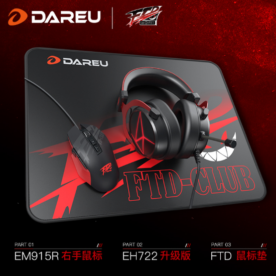 北京时间2018年8月6日,Dareu(达尔优)携手FTD战队,推出三款FTD战队合作外设,分别是EM915R右手鼠标FTD定制版、EH722升级版FTD定制版和FTD战队鼠标垫。