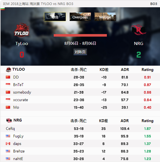 下半场手枪局NRG一波骗B后拱门夹A,侦察到对手的进攻动向后SOMEBODY大胆摸二楼取得了人数优势,但拼抢环节CeRq枪法已经彻底爆炸glock连秒三人帮助NRG拿下手枪局。第二回合TYLOO强起遇上NRG直接集合兵力打B也毫无办法,NRG拿下赛点后最终一波中路抱团拿下最后一分,以16-2拿下第二张地图,总比分2-0轻松战胜TYLOO获得本次IEM上海站总冠军。