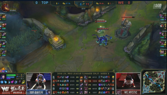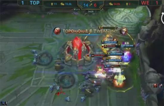 31分钟,Top破掉了WE的三路高地和下路水晶,WE背水一战主动开团。Top且战且退卖掉辅助塔姆,成功撤退,经济领先来到12000。关键时刻,WE决策失误,主动和对方接火龙团战,最终被团灭,WE遗憾输掉本局。