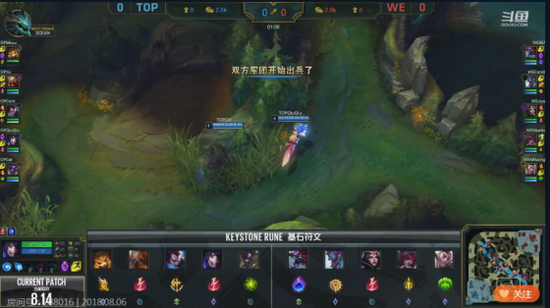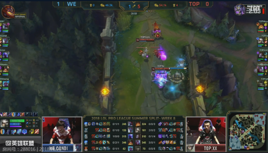 比赛前期,WE的打野巨魔帮助下路击杀了一次Top的下路组合,霞拿到两个头。随后WE下路拿到优势后滚起雪球,直接完成线上击杀。不过Top也利用上路纳尔对线的优势拿到上路一血塔。整体经济WE领先1000。