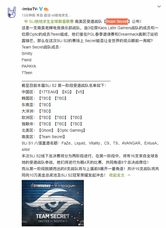 8月8日下午16时许,IMBA官博公布了SLi绝地求生群星联赛南美区获邀队伍Team Secret。这是一支南美老牌电竞俱乐部战队,由3位原Kaos Latin Gamers战队的成员和一位原Optic的成员7teen组成,他们曾在PGL春季邀请赛和Dreamhack奥斯汀站初露锋芒,那么在这次SLi S2的赛场上 Secret能否让全世界的观众眼前一亮呢?
