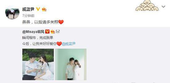 8月7日起,电竞主播Misaya若风就开始在微博预告过两天会公布一件对于自己来说的重大事件,网友纷纷猜测不已。今天若风终于在微博中高调宣布自己“瞬间爆炸,完成脱单”,更深情告白“今后,让我来好好爱你”,而示爱对象则是粉丝及媒体曾一度“怀疑”过的戚蓝尹。随后女方也甜蜜回应道:鼻鼻,以后请多关照。这波甜蜜狗粮也是撒的妥妥的。